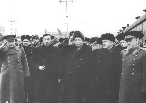 12月16日中午,毛泽东的专列开进莫斯科北站。苏共中央政治局委员、部长会议副主席莫洛托夫,国防部长布尔加宁元帅,外贸部长缅什科夫,外交部副部长葛罗米柯等前来迎接。毛泽东邀请莫洛托夫一行上车就座,要他们品尝中国特产,但莫洛托夫和布尔加宁以不符合礼仪而谢绝了。鉴于毛泽东在途中身患感冒以及天气严寒等原因,苏方只安排了一个十分简洁的欢迎仪式。由仪仗队举行迎接礼,毛泽东也只绕场一周。