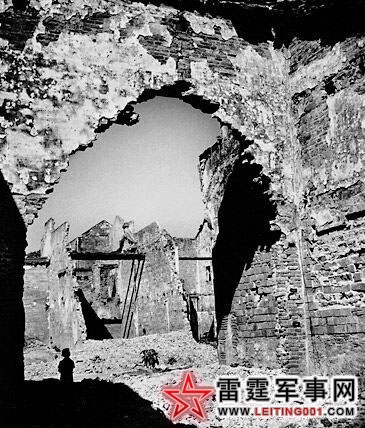 这是一位年轻的法国贵族Duy Kien 拍摄的。一位站在河内某孤儿院废墟阴影里的孤儿,法国人用美国援助的燃烧弹炸毁了他赖以栖身的孤儿院。(1946)