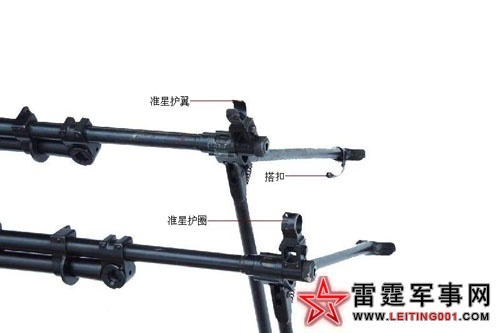 ▲56式轻机枪(上)的架腿折叠时采用搭扣固定,准星采用护翼加以保护,而56-1式轻机枪(下)的脚架上取消了搭扣,准星改用护圈保护